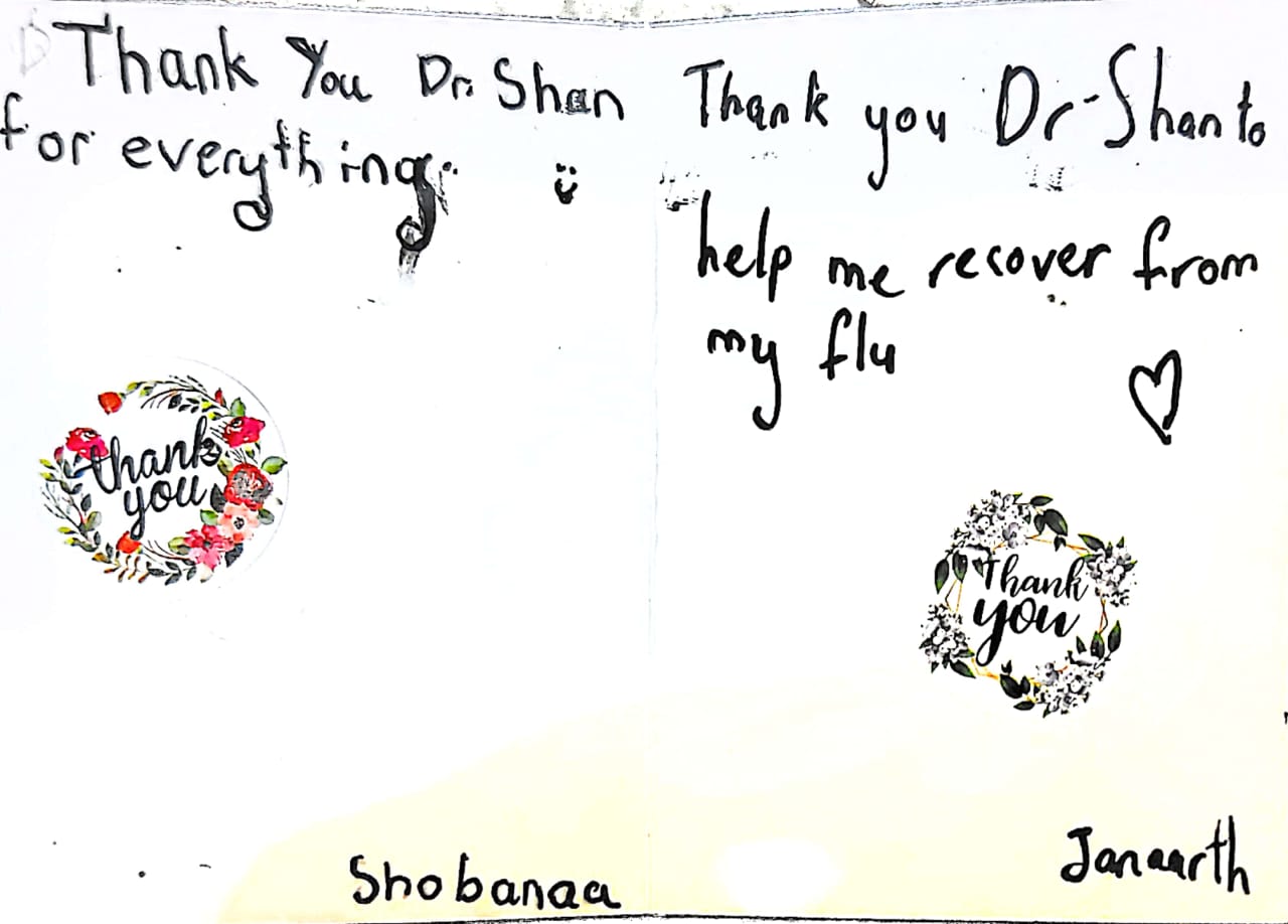 Dr.Shan, you as a guardian angel attended to her, got her admitted and treated her. You are so polite, you treated her with so much care and concern. You gave such superior treatment to our precious daughter. That moment we decided that you will be our daughter’s Paediatrician.